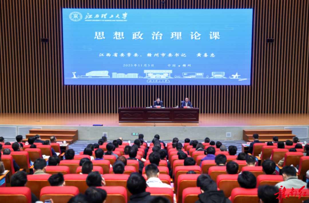11月5日,江西省委常委、赣州市委书记黄喜忠来到江西理工大学讲思想政治理论课。他围绕深入学习贯彻党的二十届四中全会精神,结合国际国内形势和赣州发展实际,和师生一起交流,勉励大家坚定理想信念、锤炼过硬本领、涵养优良品德,努力在中国式现代化建设中绽放青春光彩。