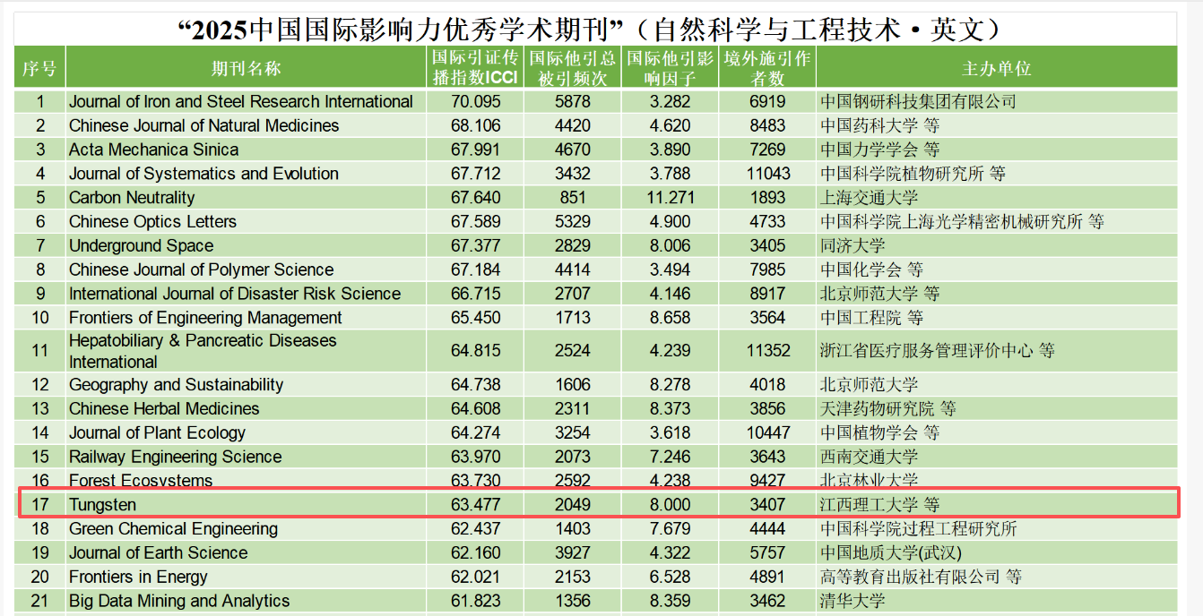 本网讯 近日,由中国知网和清华大学图书馆联合研制的《中国学术期刊国际引证年报》(2025版)正式发布。我校主办的《钨科技(英文)》(《Tungsten》)连续两年入选“2025中国国际影响力优秀学术期刊(自然科学与工程技术·英文)”榜单。在此次评选中,《钨科技(英文)》期刊核心指标——国际引证传播指数(ICCI)较去年取得较大进步,达63.477,在入选的150本同类别优秀期刊中位列第17位,较上一年度跃升95位。