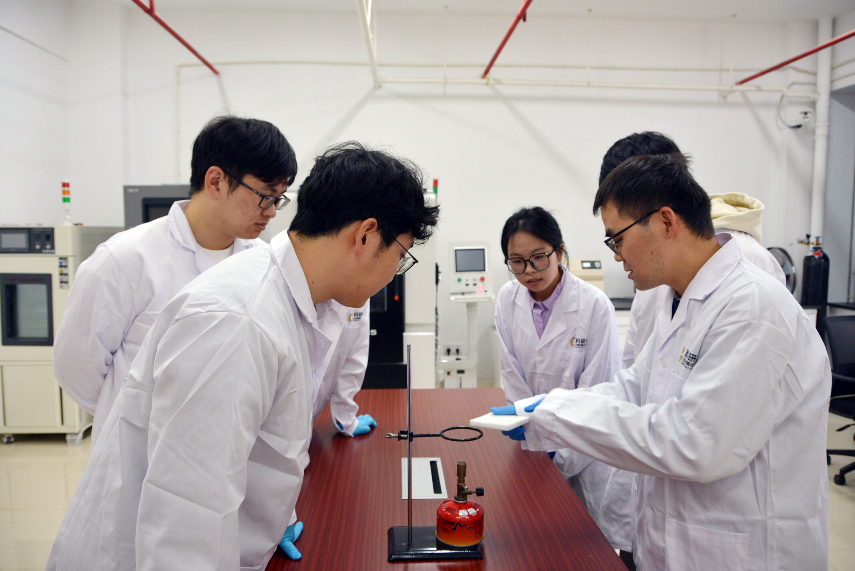 图为张思钊(右一)指导学生分析材料的隔热-阻燃-维形一体化性能