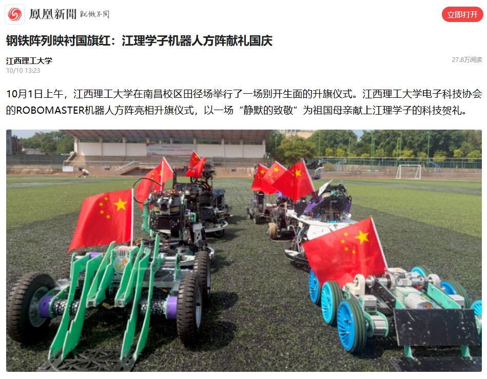 “虽然此次机器人没有动态表演,但让它们与我们一起参加此次升旗仪式,本身就是一种致敬。”江西理工大学电子科技协会成员、2023级学生廖涛表示,“这些机器人是我们亲手完成编程和调试的,它们承载着我们的汗水和对未来的憧憬。在这个特殊的日子,让它们一同见证国旗升起,就是想告诉所有人,在建设科技强国的道路上,我们青年科技爱好者将继续书写精彩的青春篇章!”(文/熊飞龙、罗雨馨 图/熊飞龙)