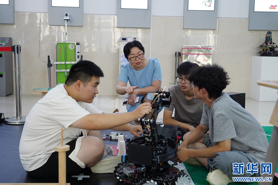6月19日,江西理工大学学生在老师常军然指导下,调试自动分拣机器人。新华网 王中庆 摄