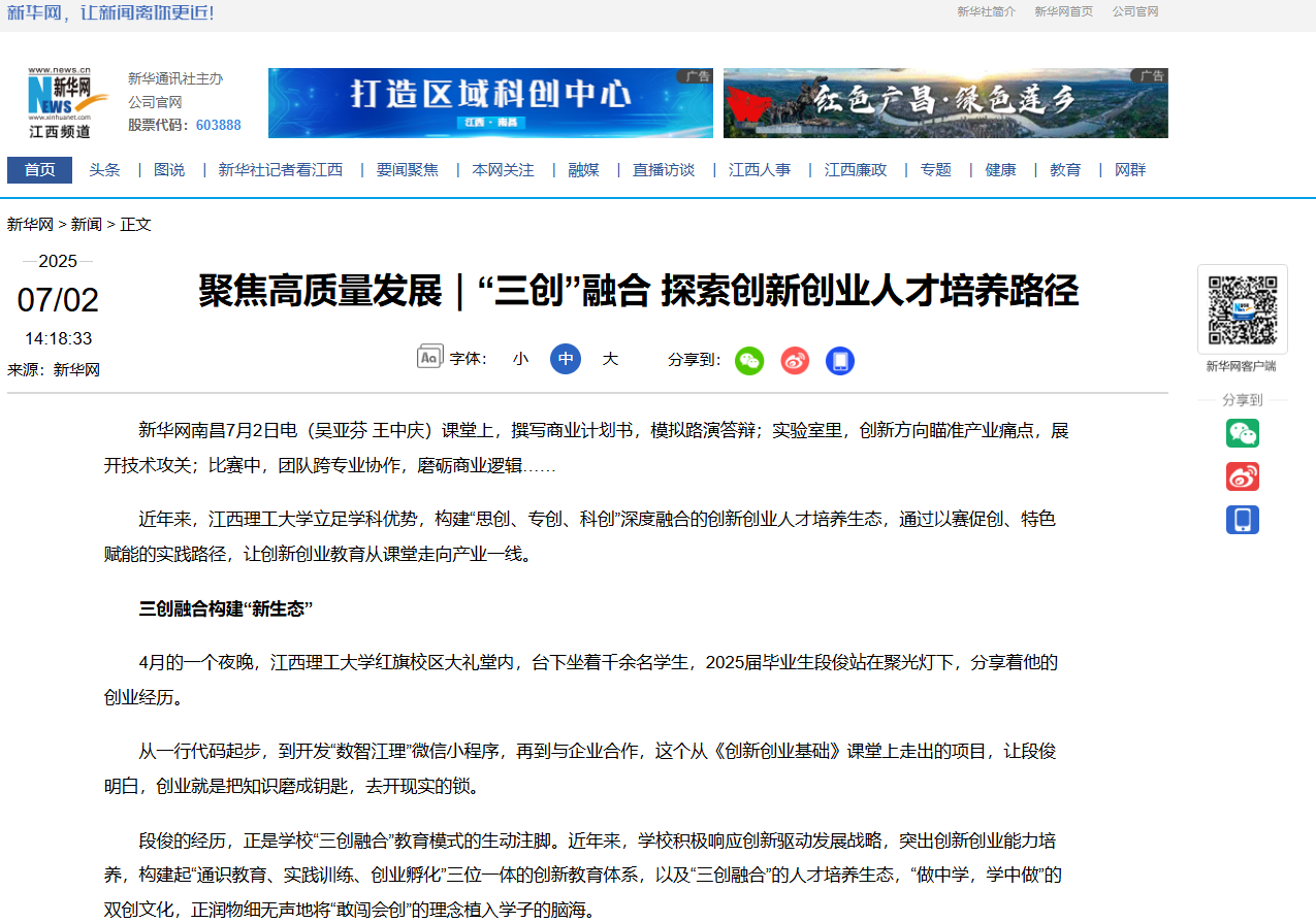 近年来,江西理工大学立足学科优势,构建“思创、专创、科创”深度融合的创新创业人才培养生态,通过以赛促创、特色赋能的实践路径,让创新创业教育从课堂走向产业一线。