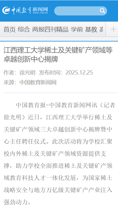 中国教育报-中国教育新闻网讯(记者 徐光明)近日,江西理工大学举行稀土及关键矿产领域三大卓越创新中心揭牌暨中心主任聘任仪式。此次活动将为学校汇聚校内外稀土及关键矿产领域资源提供支撑,助力学校全面推进稀土及关键矿产领域教育科技人才一体化发展,为国家稀土战略安全与地方万亿级关键矿产产业注入强劲动力。