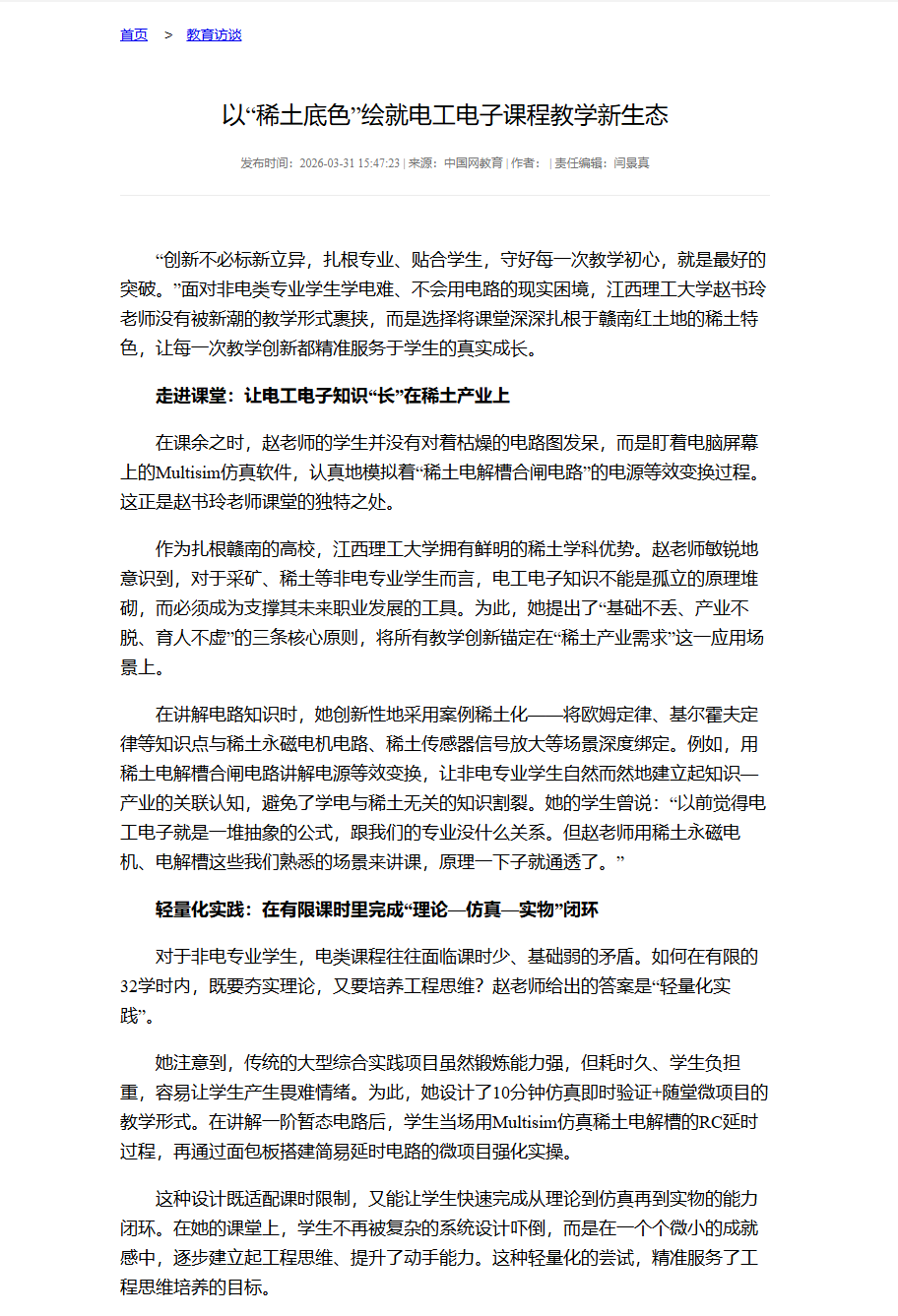 在江西理工大学的教学园地里,赵书玲老师用她的实践证明:当教学创新深深扎根于专业土壤,紧密贴合学生实际,即使是最传统的电工电子课程,也能焕发出独特而持久的生命力。她的目标从来不是做多么炫酷的教学创新,而是让学生通过这门课,既能掌握专业技能,又能读懂学校的稀土情怀,这就是她要守住的育人初心。(许明智)